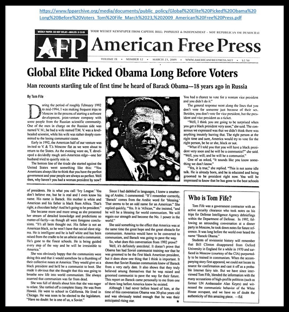 She was full of details about him that she was cager to relate. She rattled off a complete litany. He was from Hawaii. He went to school in California. He lived in Chicago. He was soon to be elected to the legislature. "Have no doubt: he is one of us, a Soviet." Since I had dabbled in languages, I knew a smatter. ing of Arabic. I commented: "If I remember correctly. 'Barack' comes from the Arabic word for "blessing.' That seems to be an odd name for an American." She replied quickly. "Yes. It is 'African,* she insisted "and he will be a blessing for world communism. We will regain our strength and become the No. I power in the world"